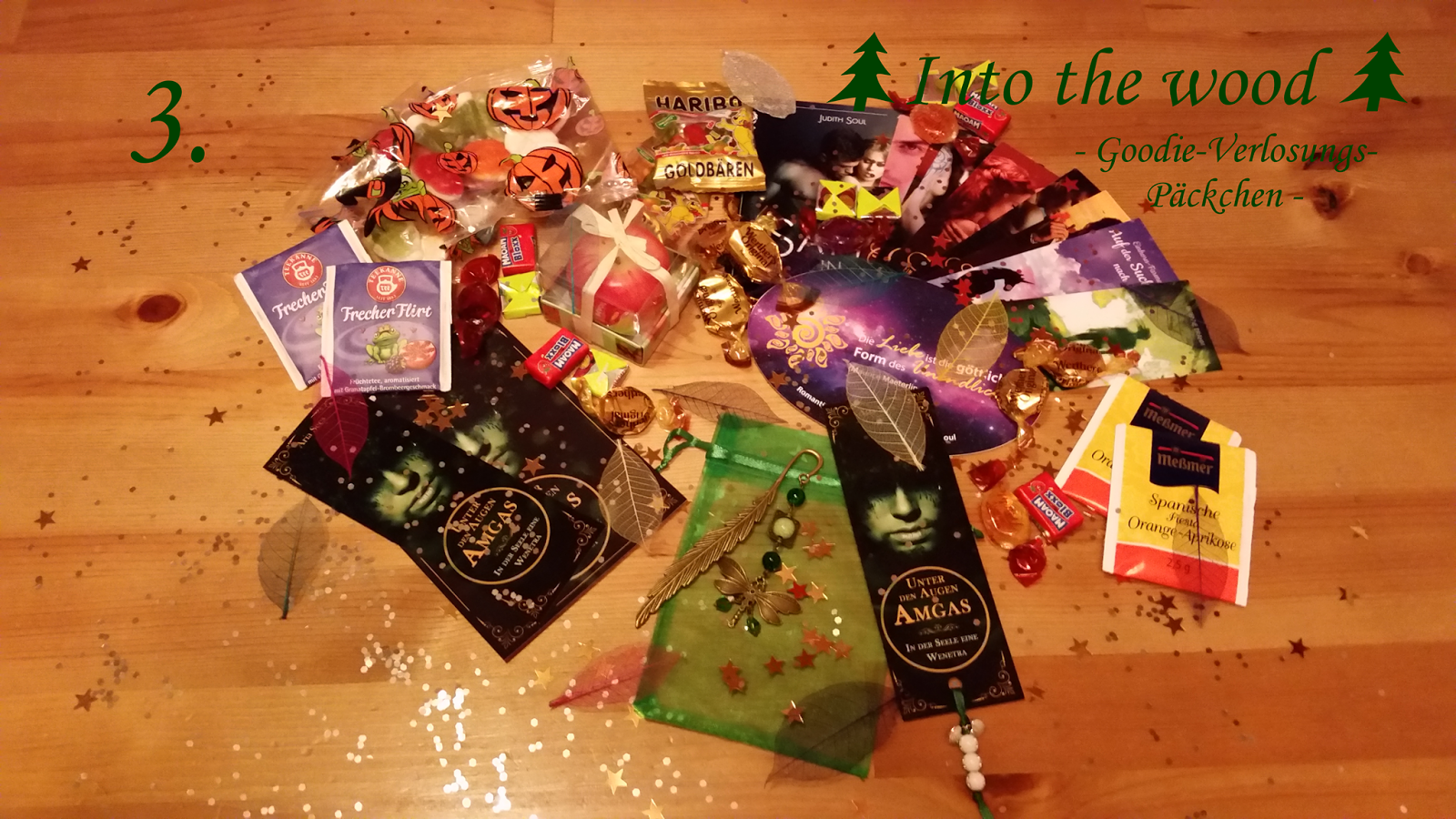 Zu den zahlreichen Lesezeichen von diversen Autoren beinhaltet dieses zauberhafte Goodie-Päckchen allerlei Naschereien. Einen Waldgrünen Kugelschreiber “Unter den Augen Amgas” mit dem man schöne Gedichte über den Abendhimmel verfassen könnte. Ein Leseband, als Lesezeichen “Blatt fliegt zu den Sternen” und eine zauberhafte “Der rote Mond versinkt im Wald” – Kette.